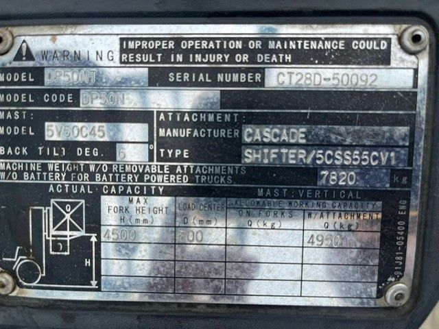 Caterpillar 5 tonne Diesel Forklift, 4.5 metre lift, side shift, low hours